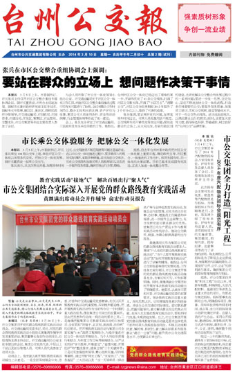 张兵强调,要正视存在的问题,如乘客候车时间过长、司乘人员礼貌用语不规范、公交线网布局不够优化等突出问题;要站在群众的立场上,从大局出发,打破行政区划的壁垒,去研究解决公交整合和发展过程中的一系列问题;要进一步统一思想、坚定信心、坚定不移地加快公交一体化进程,打造老百姓需要的公交;要提升服务质量、加强员工培训、优化公交线网、提高智能化水平,对于一些公交热点线路,适当地加密班次,以满足群众出行的需求;同时,还要加大宣传力度,倡导绿色环保、节能减排,树立良好的“台州公交”品牌形象。