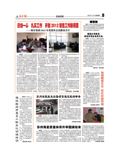 本报讯 12月11日,海星集团2012年销售工作会议在苏州海星海事电气有限公司隆重举行。会议的主要任务是认真总结2011年销售工作情况,全面分析当前销售工作面临的新形势、新任务和新要求,安排部署2012年集团的销售工作任务。此次会议由董事长兼总裁傅文隆同志主持,集团各销售代表、控股子公司生产、销售负责人及17家销售分公司负责人参加。集团公司经营副总林魏魏同志和控股子公司——江苏海欣船用阀门有限公司经营副总冷学良分别作2011年度船舶灯具、电气和船用阀门销售年度工作报告。