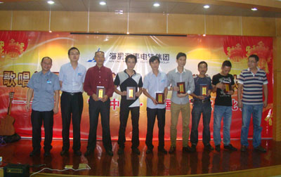 本报讯 9月28日晚,海星海事电气集团有限公司2012年“迎中秋·庆国庆”歌唱比赛在员工培训室隆重举行。常务副总李荣中、财务总监陈华、总工程师张绍飞、行政副总邬妙军及全体员工近350余人欢聚一堂,喜迎佳节。大赛由以上四位副总经理担任评委,销售部向莉和国外贸易部杨一键任主持人。本次比赛参赛人员皆来自集团公司各部门与车间的员工,参赛曲目多样,是员工共同抒发对祖国的热爱,对集团公司真情的一个平台。