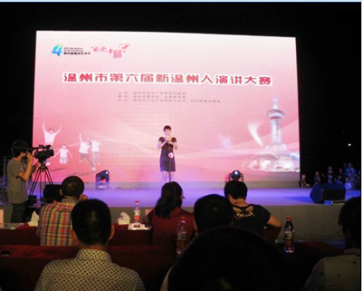 新温州人演讲大赛自2007年开赛以来已举办六届,今年的主题是“感受幸福”,吸引了百来名新温州人参赛。经初赛与复赛,共14名选手晋级决赛,经过精彩地演讲,激烈地角逐,虽未获得更高的奖项荣誉,向莉亦凭自己的原创作品《我的企业,我的家》获得“优秀奖”,可喜可贺!