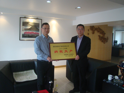 本报讯 为表彰纳税信用企业,鼓励诚信纳税,激励企业做大做强,4月3日,永嘉县财政(地税)局柯温临副局长、分管地税领导及相关科室、分局负责人一行到集团公司授牌,授予集团公司“2012年度纳税大户”荣誉牌匾,集团公司董事长傅文隆接待并陪同。