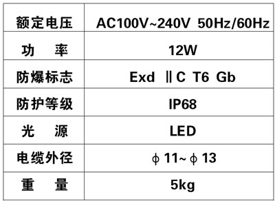 安装、使用在有爆炸性空气混合物质的场所,爆炸性混合性物质ⅡA、ⅡB、ⅡC温度组别为T1-T6,作为水下照明,水深≤3米。