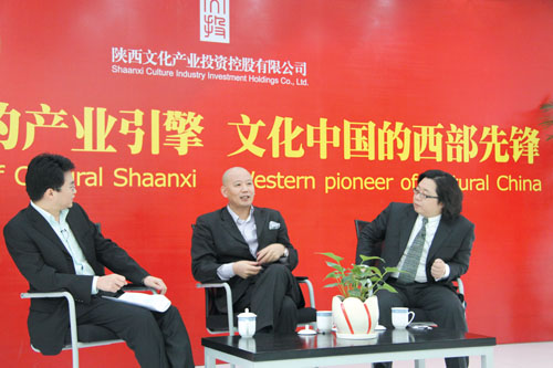 本报讯 2009年12月26日下午,陕西电视台《开坛》栏目到陕文投公司摄制文化访谈专题节目。该期节目以“文化也疯狂”为主题,邀请了零点研究咨询公司董事长袁岳、北京文化产业专家徐轶尊作为嘉宾,就文化产业与文化资源的关系、文化产业现状与文化消费、陕西文化产业的优势和挑战等问题进行了热烈激辩和深刻阐论。