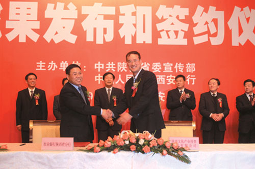 在热烈的氛围中,陕西文化产业投资控股有限公司与农行西安分行就文化项目开发贷款协议现场签约,双方将开展包括西安文艺路演艺基地在内的多个项目合作。面对文化产业发展前所未有的历史机遇,陕西文化产业投资有限公司副总经理李振林显得信心十足。他在发言中表示,陕西文化产业投资有限公司是目前国内最大的省级国有文化投资企业,今年又是本公司的第一个正式经营年度,公司将紧紧抓住历史机遇,依托文化资源,通过实施大产业布局、大项目带动、大资源整合、大资本运作,充分发挥国有大型文化企业的龙头带动和市场引领作用,建设一批文化园区,实施一批重大文化项目,推出一批文化品牌,力争公司总资产三年过百亿、年产值达到30亿元,并通过资本运作力争拥有和参股2家以上文化类上市公司。