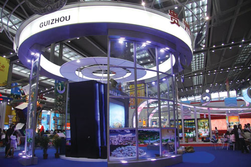 贵州馆以蓝色和银色作为基本色调,以通透圆形造型为中心,采用空间全开放的形式,能让观众以360度的视角全方位感受动漫气息。贵州馆充分展现了动漫文化的创意、时尚元素。在以民族文化、传统文化为主调的1号馆中格外显眼。