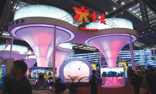 360平米的展厅、五朵牵牛花似的立体造型,以两江汇流为主体造型元素,集中宣传展示了重庆国有文化集团、四大文化产业园区。大足石刻、三峡乌木、山神漆器等品牌文化产品,川剧“变脸”、沙画、绸舞等特色文艺节目悉数亮相。新颖别致的展区设计让人仿佛置身画中,几乎忘记这是重庆的文化项目推介展台。