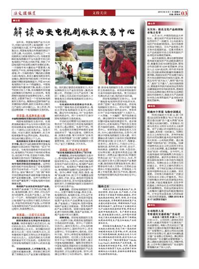 保障措施。西安电视剧版权交易中心,在硬件方面,将提供电视剧版权交易的场所和设施。该中心下设剧本交流中心、版权交易中心、衍生品和商业授权交流中心、版权评估中心、资本运营中心、节目会展中心等机构。在软件方面,该中心将制定电视剧版权交易的业务规则、创立网上交易与信息发布平台(中国电视剧交易网)、建立中国电视剧数据库、编制并定期发布中国电视剧各类版权的交易指数及综合指数、定期举办电视剧版权产品及商业授权、衍生品展览会等。该中心将通过合理分工与协调运作,组织、监督、服务电视剧版权交易,切实保护版权交易者的权益,有效地承担起版权交易市场组织者的角色,努力创造出充满生机活力的、规范的市场环境。