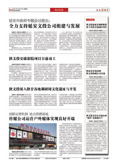 本报讯(通讯员 尚福佳) 10月12日,陕文投集团总经理助理李云霞会同杭州景年酒店管理有限公司总裁李东杭一行到延安调研黄土风情文化园区配套酒店开发事宜。李云霞一行实地考察了枣园东方红广场、东方红大剧院项目及延安职业技术学院旁星级酒店的开发项目,并实地踏勘了腰鼓山景区,详细了解了黄土风情文化园区规划和景区窑洞的修缮工作,并参观《舞动延安》大会战展览室,陕文投安塞公司相关负责人汇报了东方红广场(东方红大剧院)的项目概念规划方案。李云霞对安塞公司的吃苦耐劳,勇于拼搏,敢打硬仗,能打胜仗的工作作风给予肯定,并对黄土风情文化园区的孵化落成寄予厚望。李东杭在考察腰安塞鼓山景区后表示,窑洞酒店具有独特的民俗魅力与开发潜力,期待日后能与安塞公司合作。