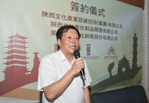 胡悦部长在签约仪式上发表了热情洋溢的讲话。他说,近年来,随着两岸关系的不断发展,陕西与台湾在经济、文化、科技、教育等发面开展了广泛的交流与合作,取得了丰硕的成果。 “十二五”期间,陕西将围绕建设“文化强省”进一步加快文化产业发展步伐。陕文投集团作为陕西大型骨干文化企业,以助推陕西文化产业跨越式发展为己任,在文化园区建设、文化项目实施、文化品牌塑造方面进行了大量的有力实践,此次与美商圆缘公司签约就是学习台湾文创产业先进经验,联手一流企业的重要举措,对于促进陕西与台湾开展文化产业合作具有积极意义。胡悦部长对双方签约表示热烈祝贺,并期待项目早日落地实施,通过此次联姻开启新的工作局面。