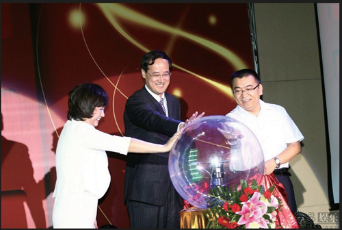 陕文投集团总经理王勇(中)在陕西文投(影视)艺达投资有限公司成立仪式上启动水晶球。