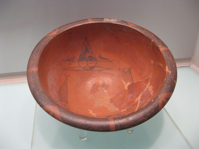 人面鱼纹饰,用黑彩描绘出由人面和鱼纹混合组成的图案。人头呈现圆形,两条弯眉又细又长,上面涂成黑色,眼睛是一条直线,鼻子呈倒“丁”字形,嘴形是漏斗状的,头顶上有一个三角形的高高的发髻,嘴下面全部涂成黑色,嘴的两边有鱼形的纹饰,两耳旁边也各有一条鱼,鱼头和鱼身都呈三角形。