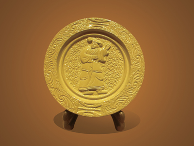 “轩辕圣帝”瓦当取桥山圣土烧制而成,圆形瓦当居中有参照黄帝陵轩辕庙石刻黄帝像手工雕刻的圣像,意为人文初祖,天地正中;四周纹饰参照与黄帝同时期的仰韶文化半坡陶器上的鱼纹与鸟纹,象征着生生不息的黄帝子孙振翼高飞,前途远大。