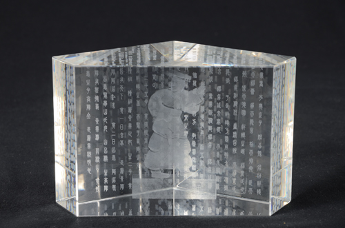 黄帝水晶雕像以黄帝陵轩辕庙石刻黄帝像为蓝本,用现代激光雕刻技术在晶莹剔透的水晶内进行雕刻,将轩辕黄帝像活灵活现地呈现了出来,背景饰以《史记·黄帝本纪》相关内容,既有古朴典雅之风又深具现代时尚审美意趣,流光溢彩,神圣奇美。