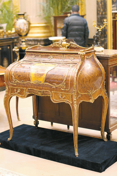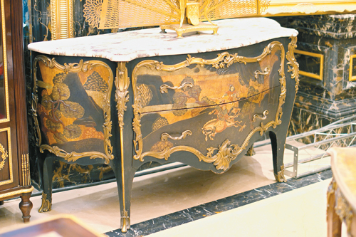 这件路易十五风格铜鎏金中国漆画抽屉边柜成为本次西洋珍品拍卖会的焦点,从45万起拍,到最后180万的成交价,掀起了整个拍卖会的高潮。这款边柜无论是堆漆、鎏金、木工还是铜雕工艺,都代表当时欧洲宫廷中国风家具的最高水准。