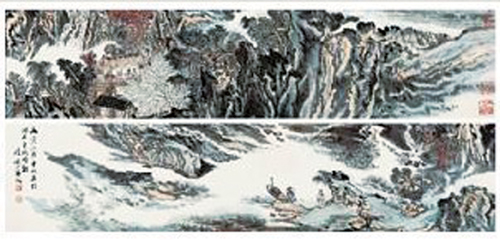 陆俨少《秋山雅集图》 尺寸:25.5×230cm 材质:设色纸本 创作年代:1986年