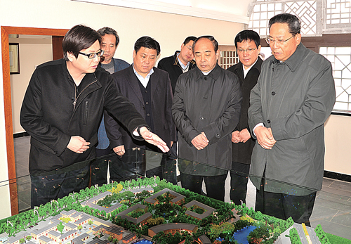 省委常委、省委组织部部长李锦斌(右一)观看黄土风情文化园区规划布局