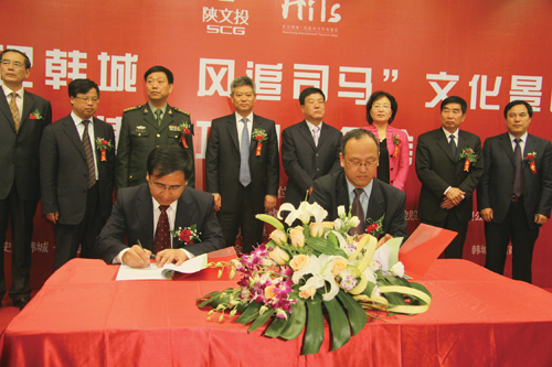 伴随着西洽会的热潮,陕文投韩城文化景区项目推介和文化周活动也如火如荼地举行。4月5日,“史记韩城·风追司马”文化景区建设项目推介暨签约仪式隆重举行,陕文投韩城公司与陕西省美术家协会签订投资1亿元的韩城古城艺术家村落项目,与陕西汉唐盛世文化实业有限公司签订投资3000万元的古玩交易市场项目,与陕西宏达市政工程有限公司签订投资7700万元的关中商会项目,与英国TEAM国际旅游咨询公司签订投资2.5亿元的黄河生态湿地公园项目,总投资额4.57亿元。渭南市市长徐新荣,渭南市委常委、军分区司令员李绮,渭南市副市长刘宝琴,韩城领导姚双年、张建中、冯双民等出席签约仪式。作为陕文投重大文化产业项目,“史记韩城·风追司马”文化景区项目规划面积20.07平方公里,该项目将通过对韩城古城、司马迁祠、黄河湿地等文化资源的保护与开发,建成集文物游、文化游、黄河山水游和农业观光游四位一体的综合性旅游目的地。4月6日至12日,由韩城市委、市政府与陕文投集团、曲江文化旅游集团共同举办的2012风追司马·韩城文化周活动也隆重举行,该活动以民间艺术展演、特色文化产品展示、文化旅游项目洽谈三大版块为特色,全方位、多角度体现韩城独特的文化魅力,开启文化陕西东大门。