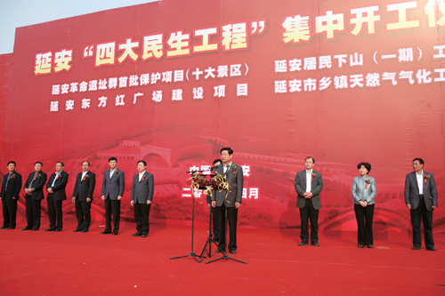 本报讯 4月17日上午,延安市隆重举行“四大民生工程”集中开工仪式。陕文投集团重大文化产业项目——延安东方红广场建设项目与延安十大革命遗址景区保护工程、居民下山一期工程、乡镇天然气气化工程奠基开工。省长赵正永出席仪式并下达开工令。省委常委、延安市委书记姚引良,副省长李金柱,省政府副秘书长陈国强等出席开工仪式。省发改委主任祝作利主持开工仪式。延安市市长梁宏贤、陕文投集团董事长段先念分别致辞。