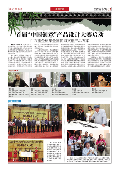 本报讯(通讯员 王飞) 4月19日,由中国西部文化产业博览会组委会、陕西中华文化促进会联合主办,陕文投集团承办的首届“中国创意”产品设计大赛新闻发布会暨启动仪式在北京中华世纪坛召开。