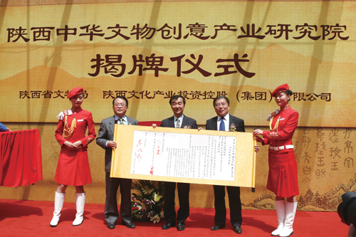 ■ 4月25日,陕西中华文物创意产业研究院在陕文投集团揭牌成立。副省长郑小明、省政府副秘书长孟建国等领导出席揭牌仪式。国家文物出版社、西安碑林博物馆、陕西中华文物创意产业研究院在仪式上共同签约《开成石经》出版项目。