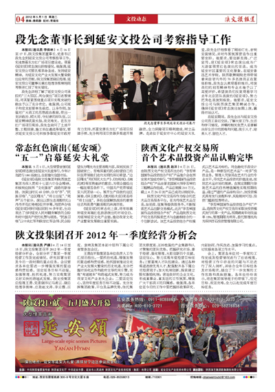 本报讯(通讯员 李保林) 4月16日至17日,陕文投集团董事长、党委书记段先念到延安文投公司考察指导工作,实地察看东方红广场项目建设地,观看《延安颂》常态演出排练情况。他强调,延安文投公司要扎根革命圣地、发扬延安精神,为延安文化产业大发展大繁荣做出应有的贡献。陕文投集团副总经理、延安文投公司董事长兼总经理李振林陪同考察并汇报了有关情况。