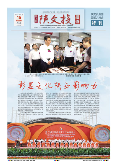 作为西部文博会的运营商之一和重点参展企业,陕西文化产业投资控股(集团)有限公司通过极富现代感和科技元素的展馆,全面展示了陕西优势文化资源和企业发展格局。同时,陕文投策划举办的“第三届中国·西安国际民间影像节”、“首届‘中国创意’产品设计大赛”、“2012西洋古董·艺术品博览会”以及“好画谁来买——陕西书画中心平价艺术季”四大主题活动好评如潮,引发社会强烈反响。肩负着繁荣和发展全省文化产业重任的陕文投,再一次以其鲜明的表现风格、充实的文化项目和富有创意的文化活动,践行“让陕西文化走向全国,让中华文化走向世界”的企业使命,努力彰显文化陕西的影响力。