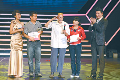 获得最佳制作人的孙春龙(左一)将作品《老兵回家》中的抗战老兵请到舞台上讲述当年抗日故事