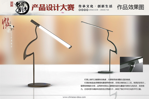 点评:仙鹤是中国传统文化里的吉祥图案,是皇家贵族福寿与清廉的象征,也是尊贵、杰出的代表。作品以瑞鸟仙鹤为元素,设计出具有实用功能的灯具,线条生动,造型简约,寓意吉祥,是居家的典雅摆设,具有十分浓郁的传统文化特色。