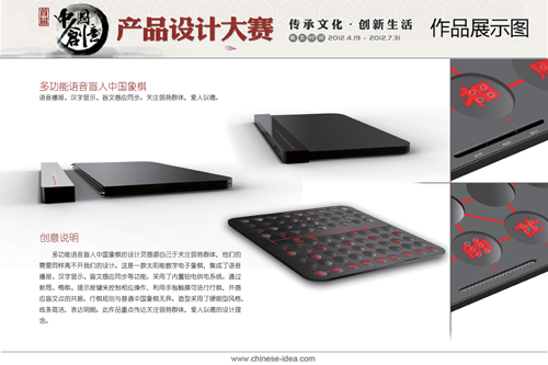 点评:作品将中国国粹象棋与现代先进的电子语音科技和太阳能技术有机结合,体现出传统文化创新的大胆尝试,材质携带方便,造型简约优美,普及性强,且具有盲文识别功能,顺应了当今绿色环保设计、人性化设计的潮流。