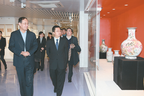 梁信军和汪群斌还分别参观考察了陕文投文仿公司产品展示厅、陕西文化产权交易所,进一步了解了陕文投在文化艺术品和文化产权交易领域的发展情况。