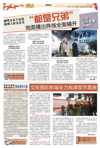 由陕文投影视公司、北京紫禁城影业公司联合出品,陕西文投(影视)艺达投资公司承制的三十三集都市情感大戏《都是兄弟》,自2012年9月起相继登陆福建、石家庄、深圳等多家地面频道,在全国范围内铺排播出阵线,为该剧在北京卫视的上星首播打响热身战。