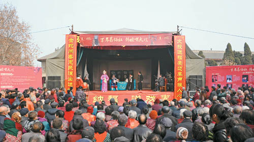 2月19日,金城广场舞台在搭建过程中,不时有群众前来咨询,当听说要在这里举办为期三天的“迎春纳福·送戏惠民”活动时,大家都十分激动,期待着大戏开场。20日早晨九点多,金城广场人山人海,有从街巷邻里那里听说赶来的,有从电视公告了解到后从乡镇骑摩托车赶专程来看。古城居民张大娘说,听说风追司马文化景区送戏到古城,她和老伴一大早就来到现场占好位置。当看到平时只能在电视上看到的戏曲名家时,张大娘高兴地说:“能在自家门口看到如此精彩的戏曲演出,这是我们在蛇年春节里最高兴的一件事”。此次文化演出,由著名表演艺术家、国家一级演员、中国戏剧梅花奖获得者、西安易俗社社长惠敏莉带队,80余名艺术家为韩城古城带来三天的文化盛宴。期间,《三滴血》、《夺锦楼》、《翰墨缘》、《慈母泪》等经典大戏一一登场。惠敏莉现场演唱《夺锦楼》及《柳河湾的新娘》中的精彩选段,点燃了韩城父老的热情。当那句“祖籍陕西韩城县……”唱响后,台上台下更是一阵共鸣,现场气氛瞬间高涨。演出现场,千余位观众被演员专业、娴熟的唱腔所感染,不时报以热烈的掌声,有的观众则低声哼唱,一副陶醉的幸福感洋溢在脸上。据统计,仅20日大戏开场首日,现场观众就超过2000余人次。