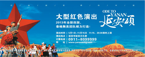 据延安文投有关负责人介绍,为便于广大游客了解演出、订购门票,《延安颂》官方网站将于4月1日隆重上线。网站涵盖订票、资讯中心、剧目信息、演出信息、活动焦点、新闻动态、精彩剧照、精彩视频等15大版块,信息丰富、内容精彩,为广大游客走近《延安颂》、了解《延安颂》提供更加便捷全面的服务。目前,演出APP软件也正在紧锣密鼓的研发当中。2013演出季,将于2013年5月1日在延安大礼堂正式拉开帷幕。