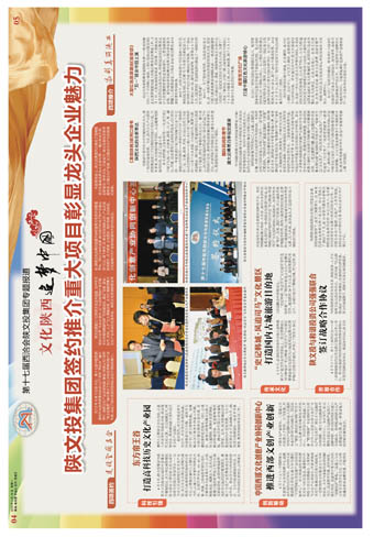 2013年4月5日至9日,第十七届中国东西部合作与投资贸易洽谈会(以下简称“西洽会”)盛大举行,陕西文化产业投资控股(集团)有限公司(简称“陕文投集团”)集中展示了近三年的发展情况和产业布局,完成了四大项目的签约以及四个项目的推介。