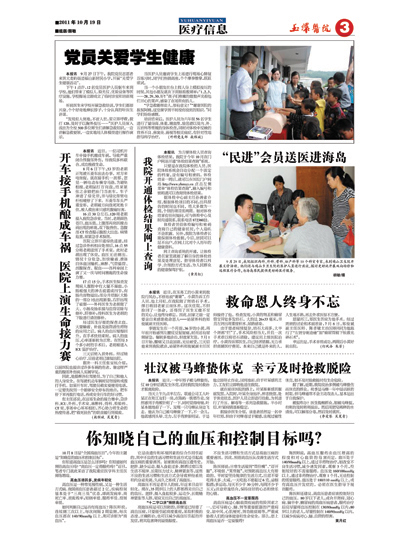 培训结束后,医护人员为六年级56名学生进行了量身高、体重,测血型,验色谱以及内、外、五官科等常规的身体检查,同时对体检中反映的营养不良、鼻窦炎、弱视等相关病症,有针对性地指导科学治疗。 (外科党支部 敖程斌)