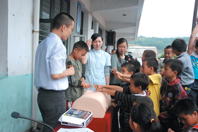下午1点许,12名党员医护人员驱车来到学校,他们带来了模拟人、验光仪、化验设备等医疗设施。学校操场立即成立了临时诊室和培训现场。