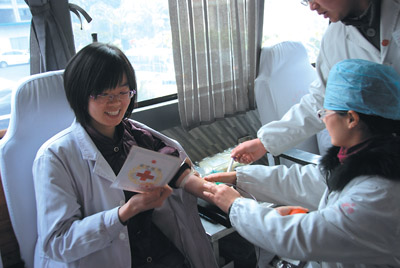 上午8点40分,台州市中心血站将采血车开到了医院。在献血现场,笔者看到,有的职工刚刚下夜班就赶来参加献血,上班的职工不顾工作劳累安排好工作,也赶紧抽时间参加献血。在进行了一项项身体检查、血液化验后,都安全顺利的献出了自己的股股青春热血。他们当中,有的是第一次献血,有的则献过好几次了。