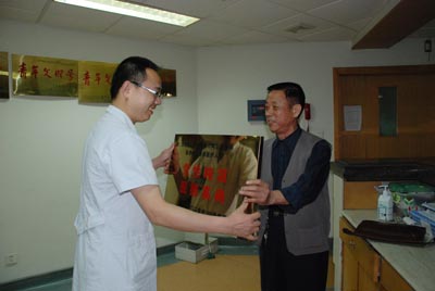 6月3日一大早,坎门的李大伯带着两块牌匾,冒雨来到我院,感谢外科的郑俊斌、陈孝敏及外二科全体医护人员。据了解,李大伯前不久因病在我院外二科住院,郑俊斌副主任医师、陈孝敏主治医师为他进行了手术,解除了困扰他多年的疾病,于是特地制了两块牌匾,以表感谢。 黄月红/摄
