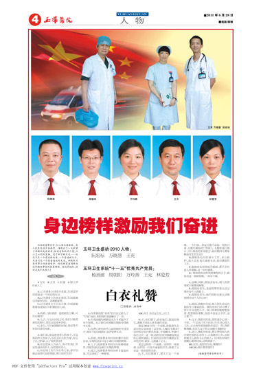 白衣使者舞长空,仁心诣术满杏林。在人民医院这片杏林里,涌现出了一大批甘于奉献的先进典型:临危受命的万小慧,以心交心的阮宏标,忠于职守的王充……他们只是一个普通的母亲,一个普通的儿子,或者只是一个普普通通的丈夫,却默默为医学事业付出着艰辛,他们的家庭同样为这奉献的事业做出着牺牲。这就是他们,这就是我们玉医人!
