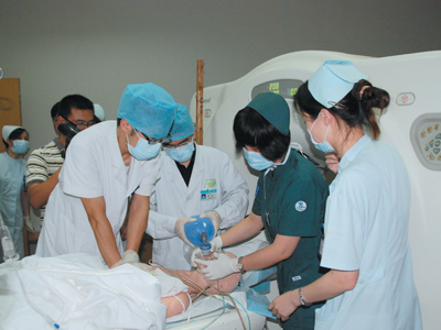 7月29日下午,“上消化道出血”急救演练中,“病人”做CT检查时心跳呼吸停止,医护人员施救。