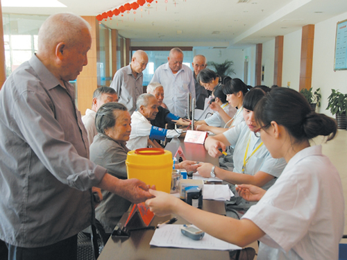 医疗队一到长者公寓就忙开了,他们在大厅摆置了“临时诊室”,亲切地与老人交谈,热情地为福利院老人量血压、测血糖、做心电图,检查他们的健康状况,热情解答有关老年疾病防治知识,向他们提出健康保健建议。