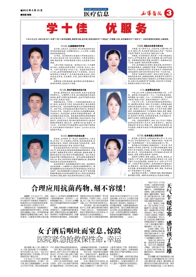 3月8日上午,玉环卫生2011年度“十佳”人物评选揭晓,我院吴月超、陈文辉、张宝杭被评为“十佳医生”,万晓慧、叶会、翁芝敏被评为“十佳护士”。本报刊登他们的事迹,以飨读者。