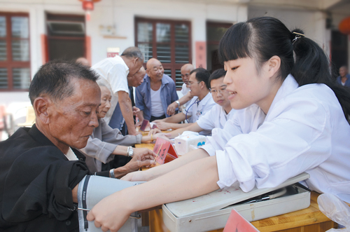 当天上午8时,10位医护人员带着血压计、心电图机、B超机等来到大麦屿街道敬老院,为这里的老人量血压、测血糖、体检,给他们解答各种医疗保健咨询。