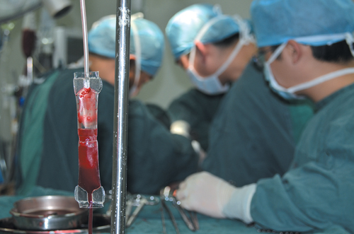 麻醉医生经综合评估,立即予以实施自体血回输技术。外科医生一边用吸引器吸取胸腔内的积血,一边为小石修补破损的肺脏,麻醉医师将病人血液回收、净化,术中3000多毫升红细胞(相当于6000毫升左右的全血)加压回输给了小石。