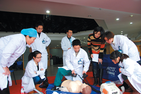 1月中旬,我院组织医生急救技能考核。每位医生考核结束后,考官郑孝敬(右4)副主任医师一一给予详细点评、指导,纠正其操作过程中出现的错误,直到他们对心肺复苏、呼吸皮囊、除颤等技能真正完全掌握为止。许多医生也非常认真,主动与郑医生交流,学习各项急救技能操作要点。 黄月红/摄