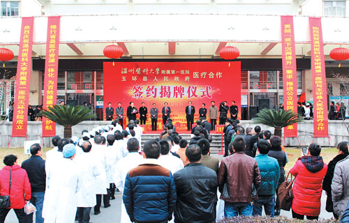 当天上午,温医一院与县人民政府在我院门诊楼门口举行医疗合作签约揭牌仪式。县委书记张加波、温州医科大学校长瞿佳分别致辞,温医一院院长陈肖鸣与县长林先华签署合作协议;浙江省卫计委医政处处长王桢、温州医科大学校长瞿佳、温医一院院长陈肖鸣、市卫生局副局长叶向阳一起为“温州医科大学附属第一医院玉环分院”揭牌。