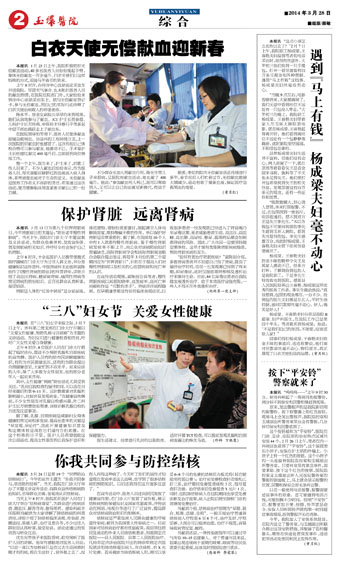 本报讯 3月13日为第九个世界肾脏病日,今年肾脏病日的主题是:“防治老年慢性肾脏病”。当天上午,我院在门诊大厅主题宣教及义诊活动,为群众免费体检、发放宣传册、普及肾脏病相关知识,并呼吁全社会保护自己的肾脏。
