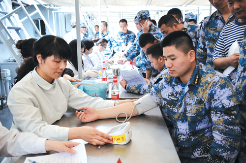 医护人员在舰上搭起了临时诊室,为官兵们体检。医护人员为每位战士的心肺、肝胆、血压、血糖等方面进行了仔细全面的诊查。对于体检中发现的问题,医护人员现场为官兵详细加以解释,并开办“男性疾病保健”健康讲座,介绍了相关的疾病知识,提醒他们在日常工作生活中应注意的健康问题。