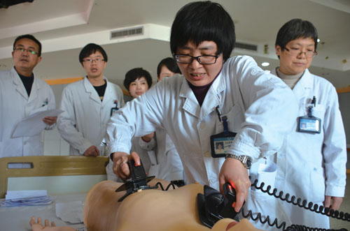 图为2014年12月,我院举办心肺复苏培训,分批组织考核,确保全体医护人员人人操作过关。
