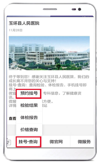 预约方法简单,扫描二维码或加公众号“玉环县人民医院”,点击下方菜单栏“挂号·查询”,即可进入预约挂号页面。进入后,根据您的需要选择科室、医生、就诊时间,确认预约挂号信息,成功预约后手机收到就诊信息。除了预约挂号以外,你还可以足不出户通过微信查询检验结果、体检报告、价格信息等。